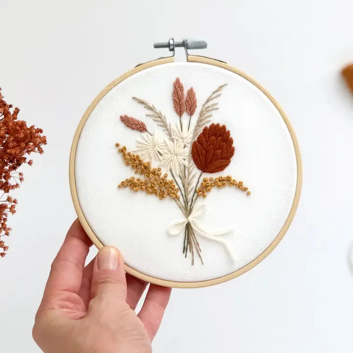 This floral embroidery kit is a perfect DIY craft for anyone wanting to learn modern hand embroidery. Designed for beginners, it makes a great needlecraft project. Each kit includes all needed supplies and a QR code to download detailed stitching guide and instructions with step-by-step photos on how to create this beautiful fall inspired design.